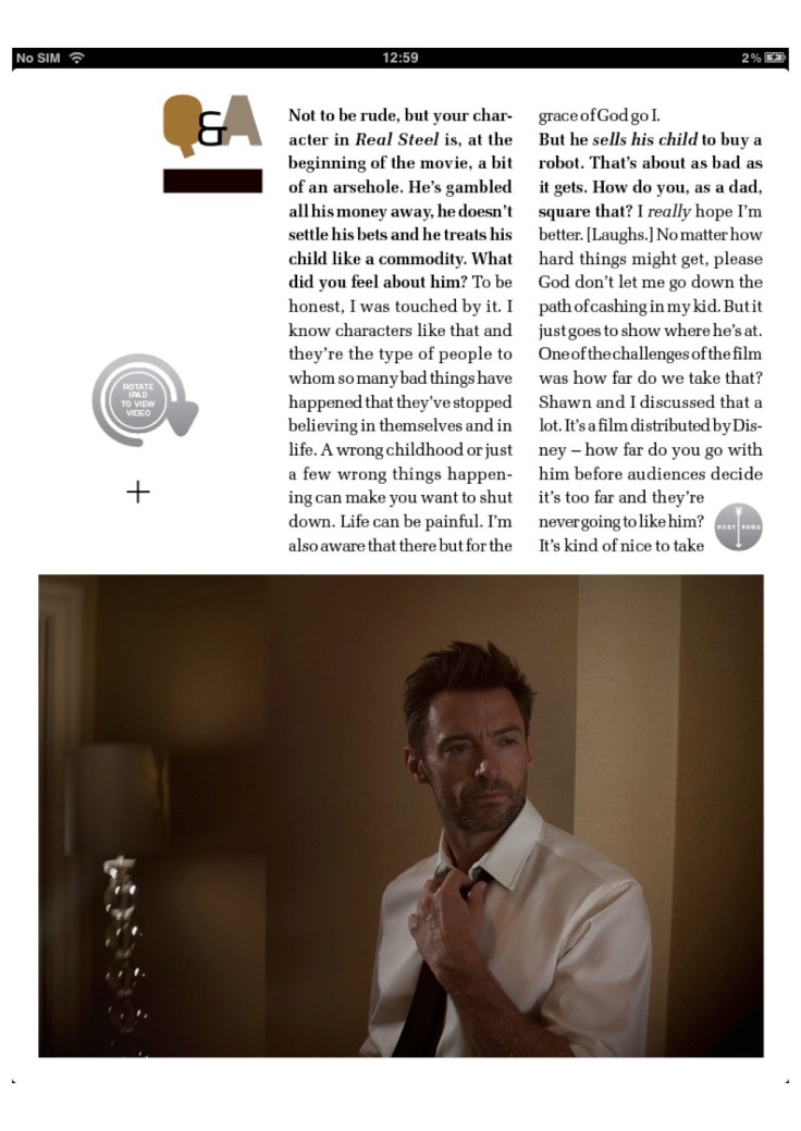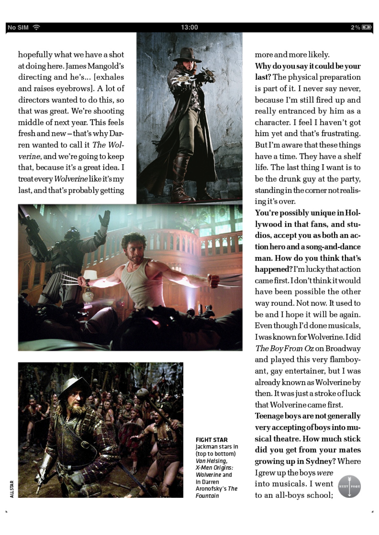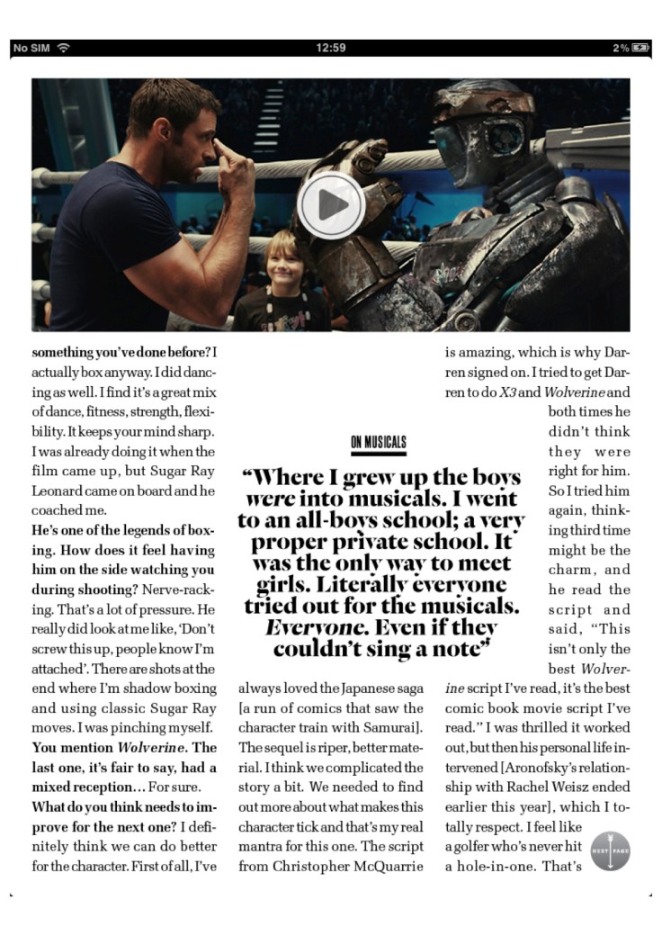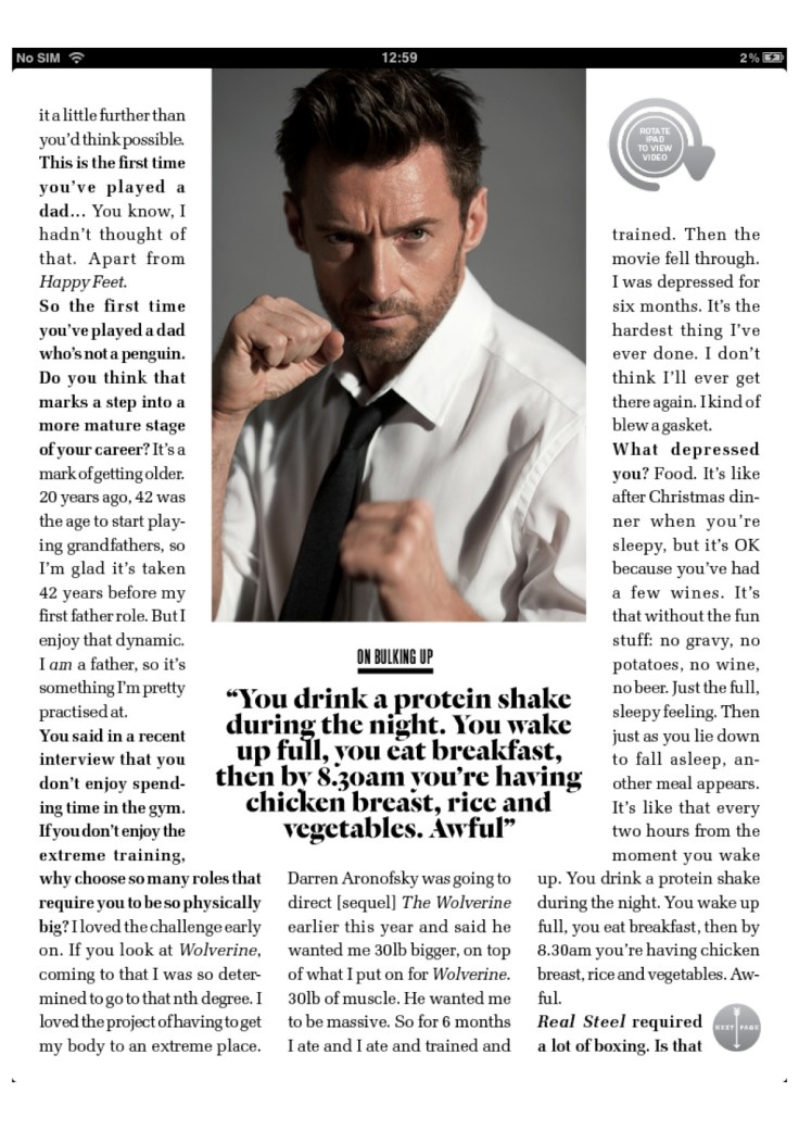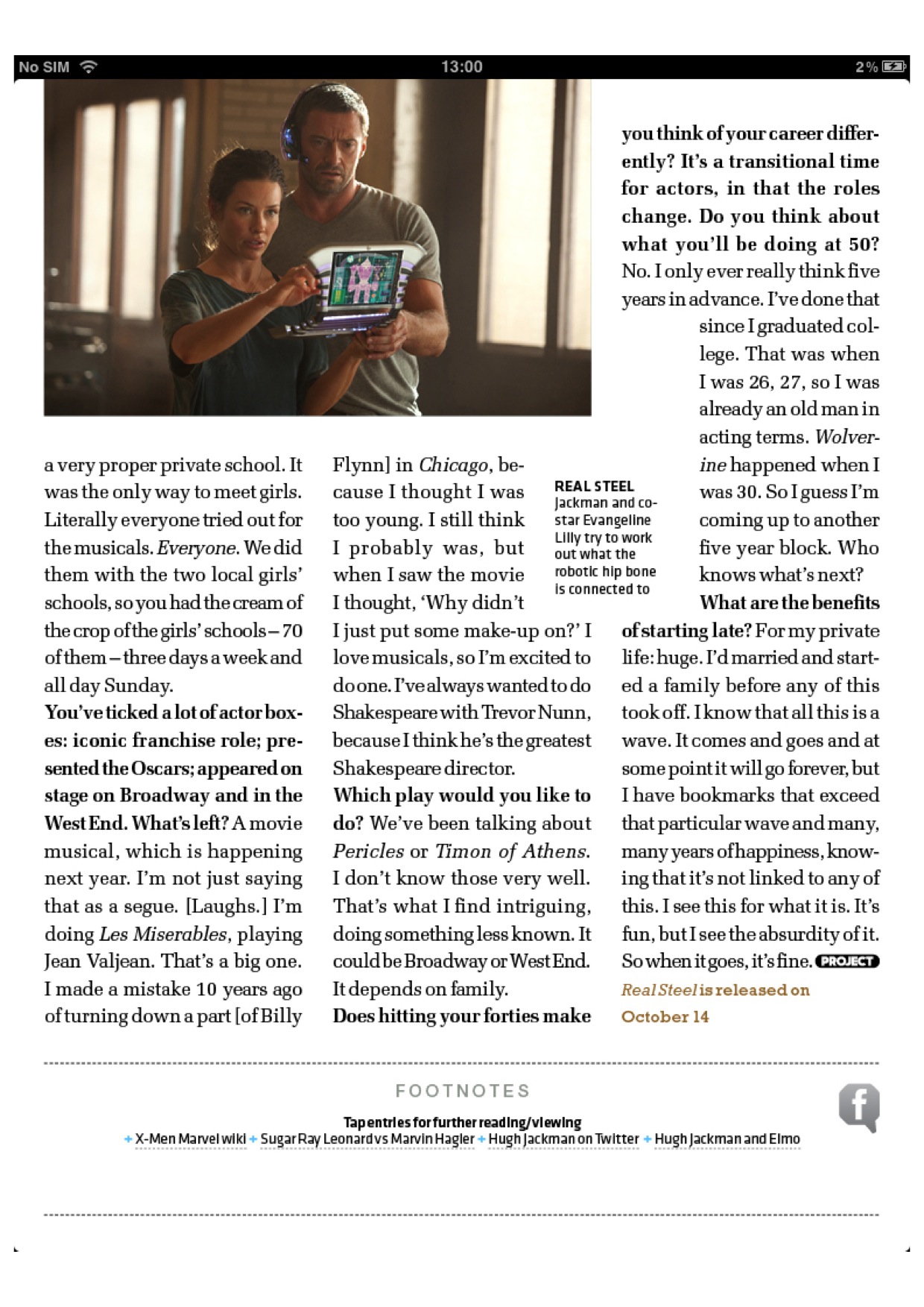 Hugh Jackman, Project Cover feature interview with Hugh Jackman for the movie Real Steel. Published in Project #10. Share this: Click to share on X (Opens in new window) X Click to share on Facebook (Opens in new window) Facebook Like Loading... Related Leave a comment Cancel reply Δ