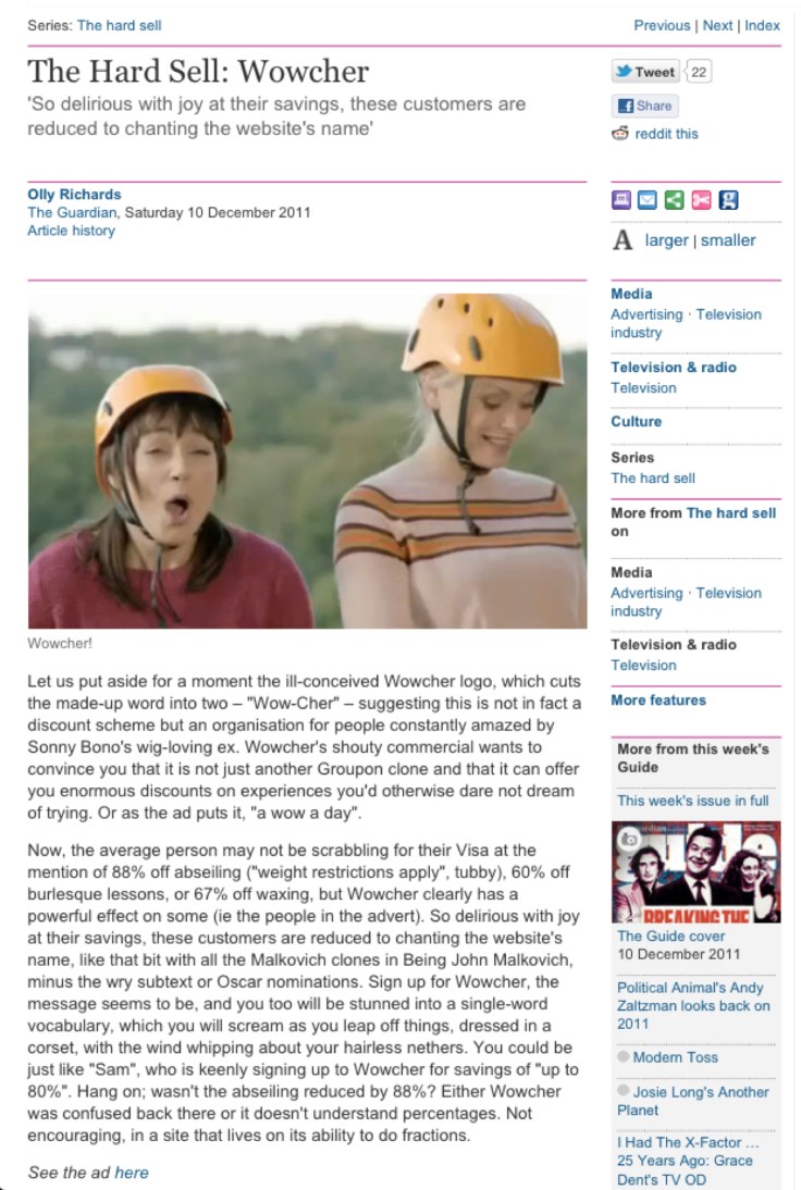 Breakdown of the (really terrible) Wowcher ad for the ‘Hard Sell’ column in The Guardian Guide.