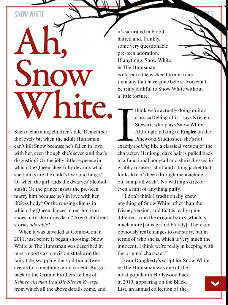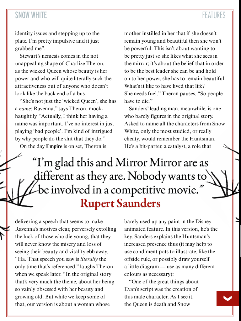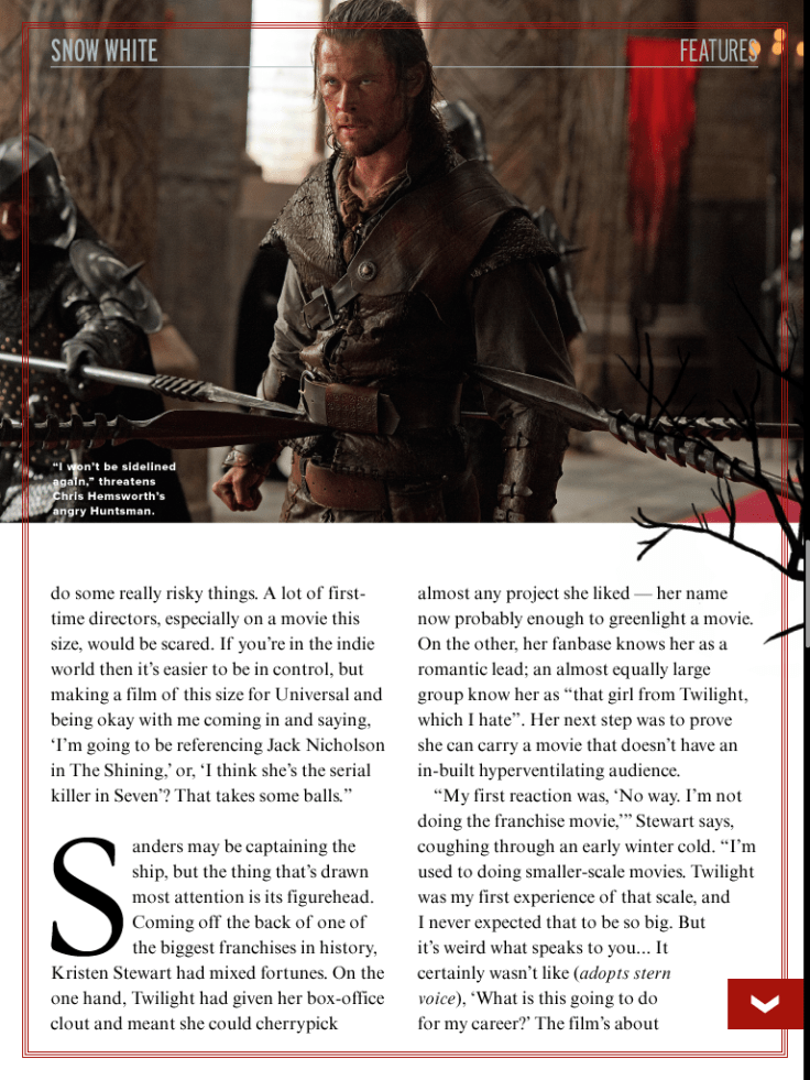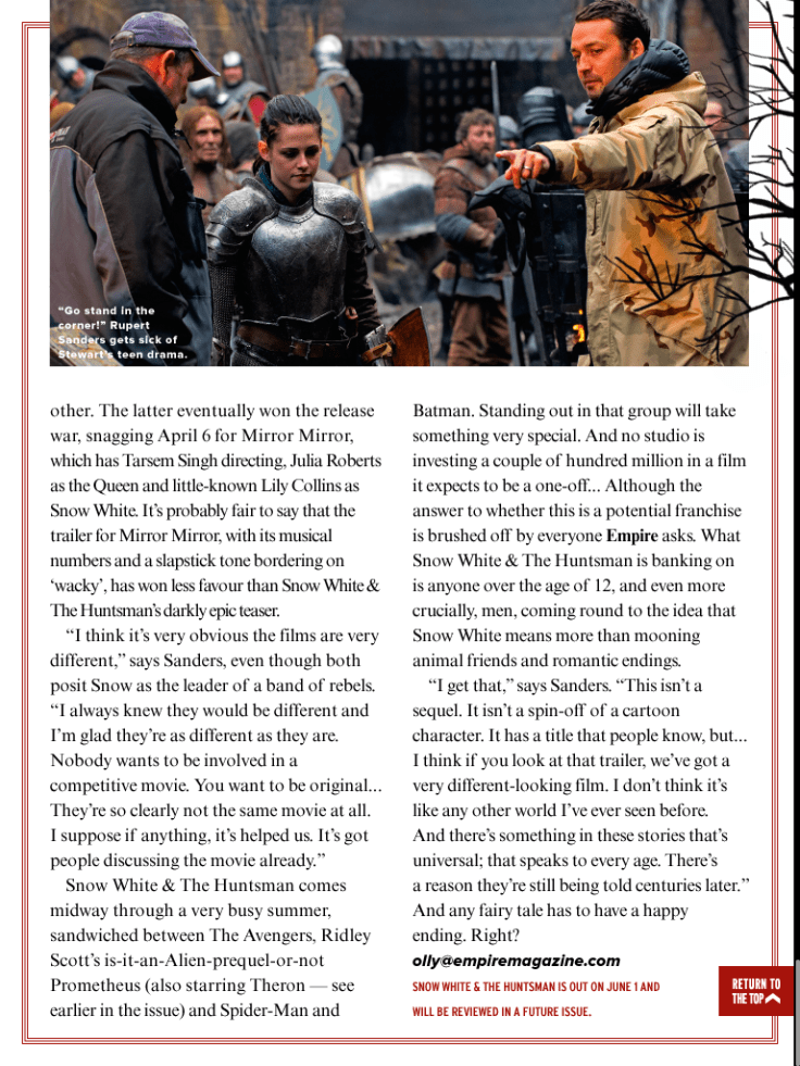 Preview feature on Snow White and the Huntsman, including interviews with Charlize Theron, Kristen Stewart and Chris Hemsworth, for the May 2012 issue of Empire magazine.
