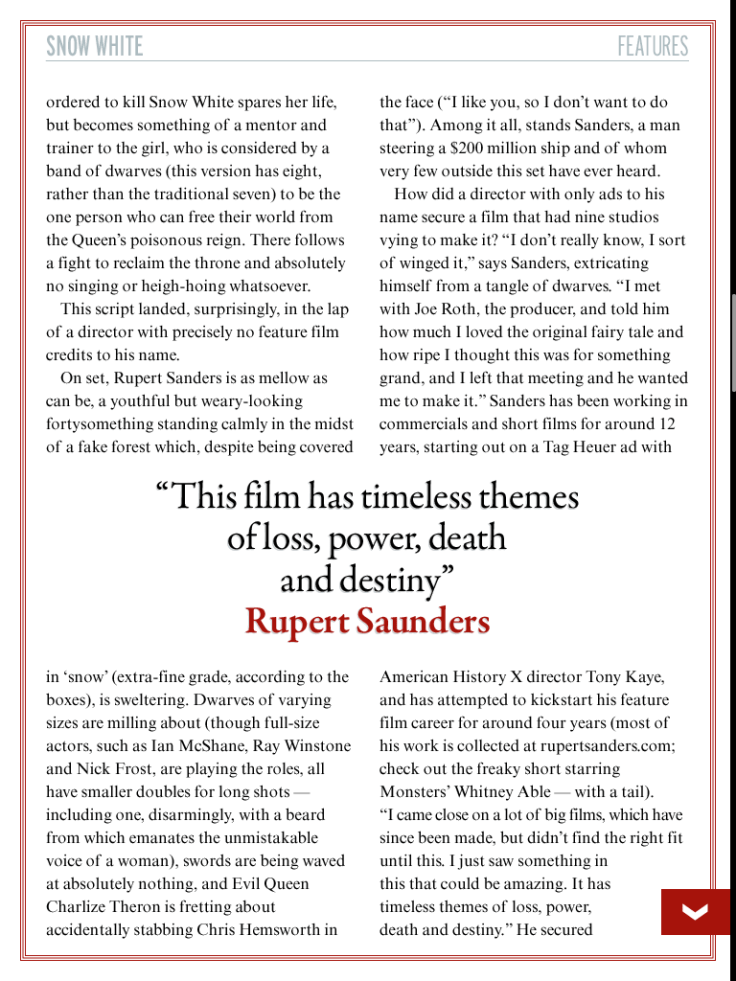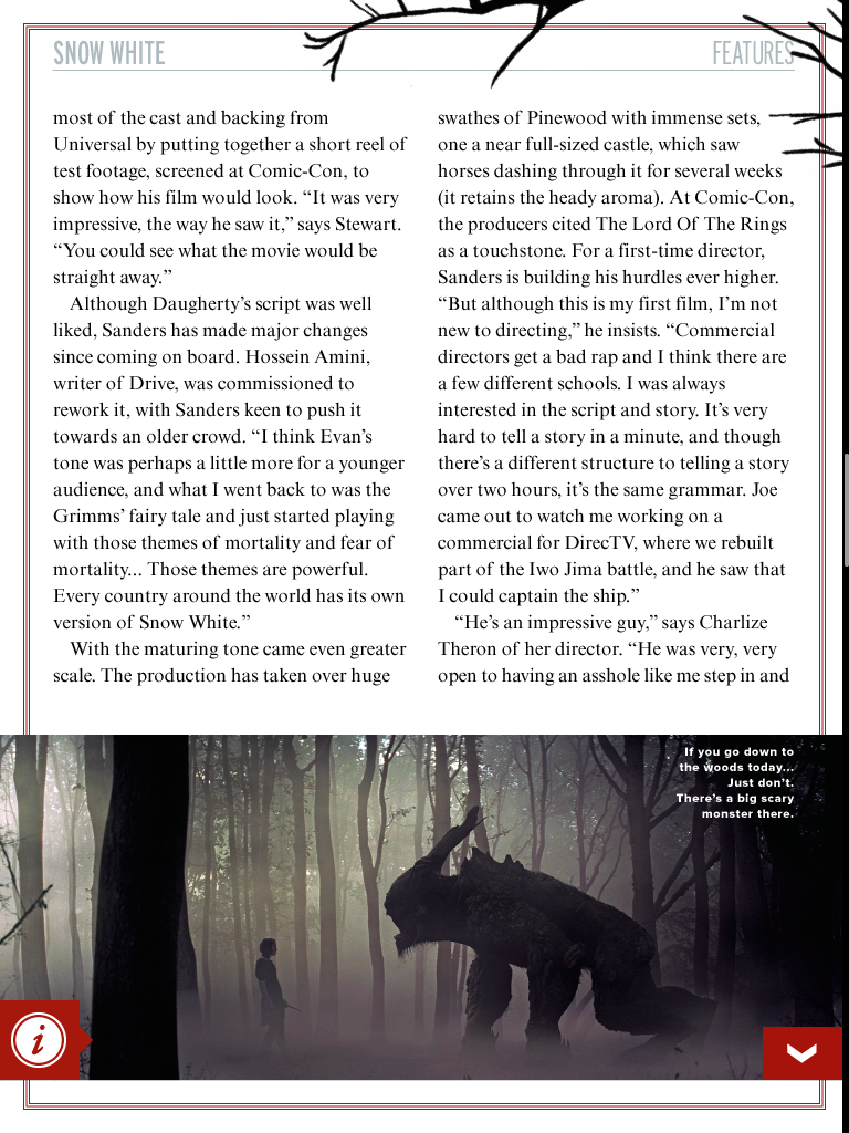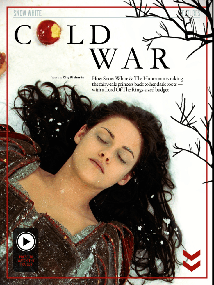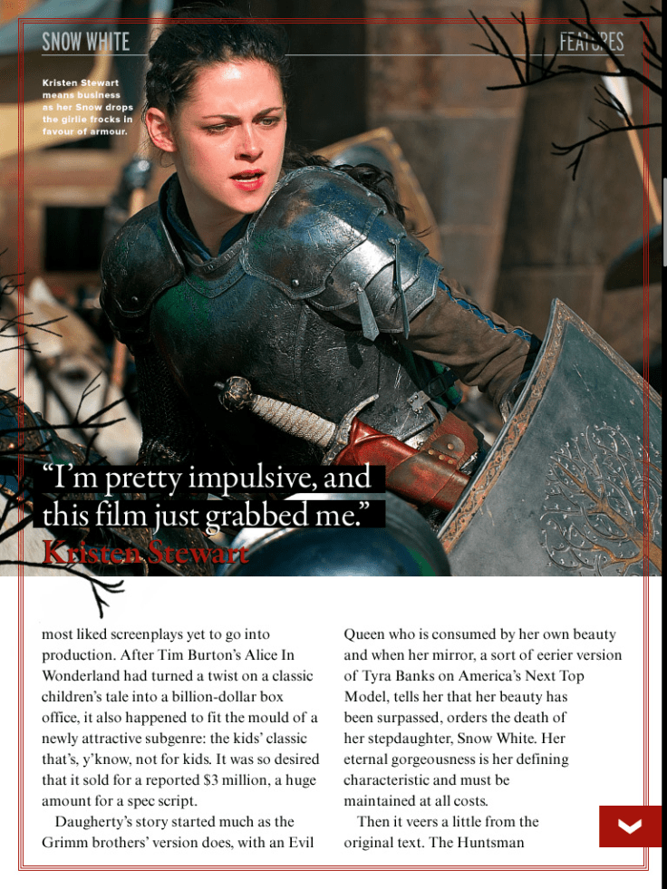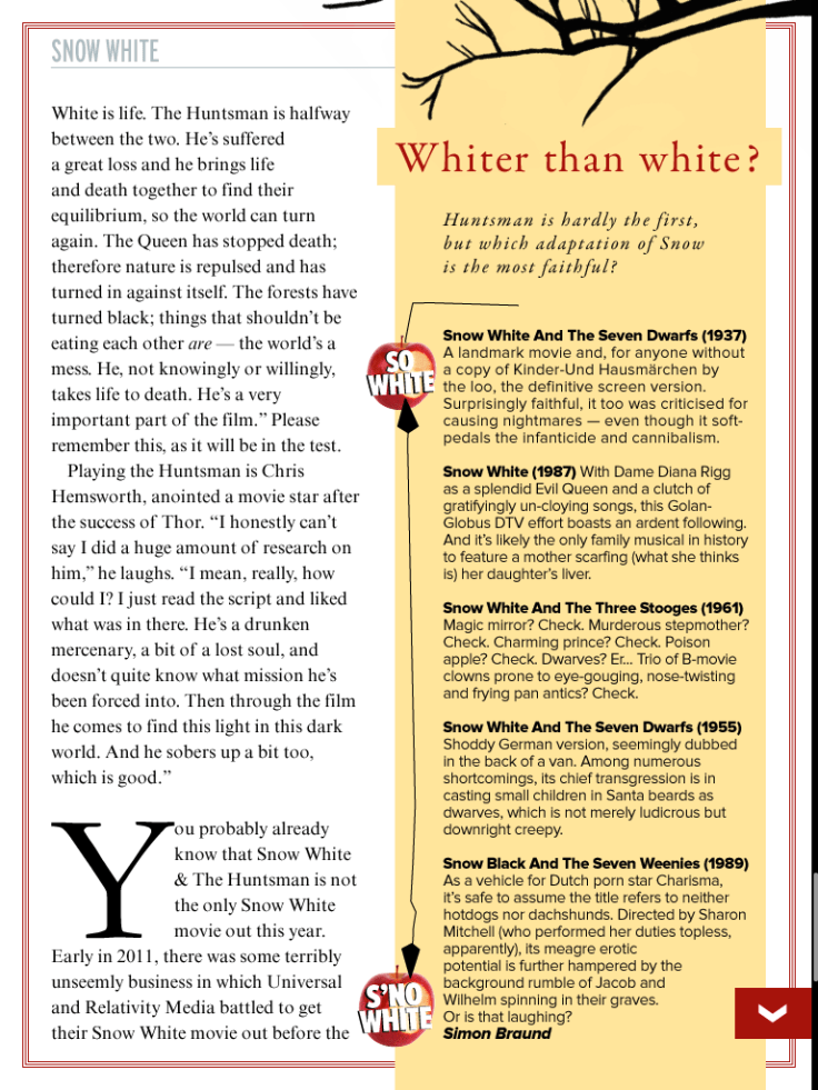 Preview feature on Snow White and the Huntsman, including interviews with Charlize Theron, Kristen Stewart and Chris Hemsworth, for the May 2012 issue of Empire magazine.