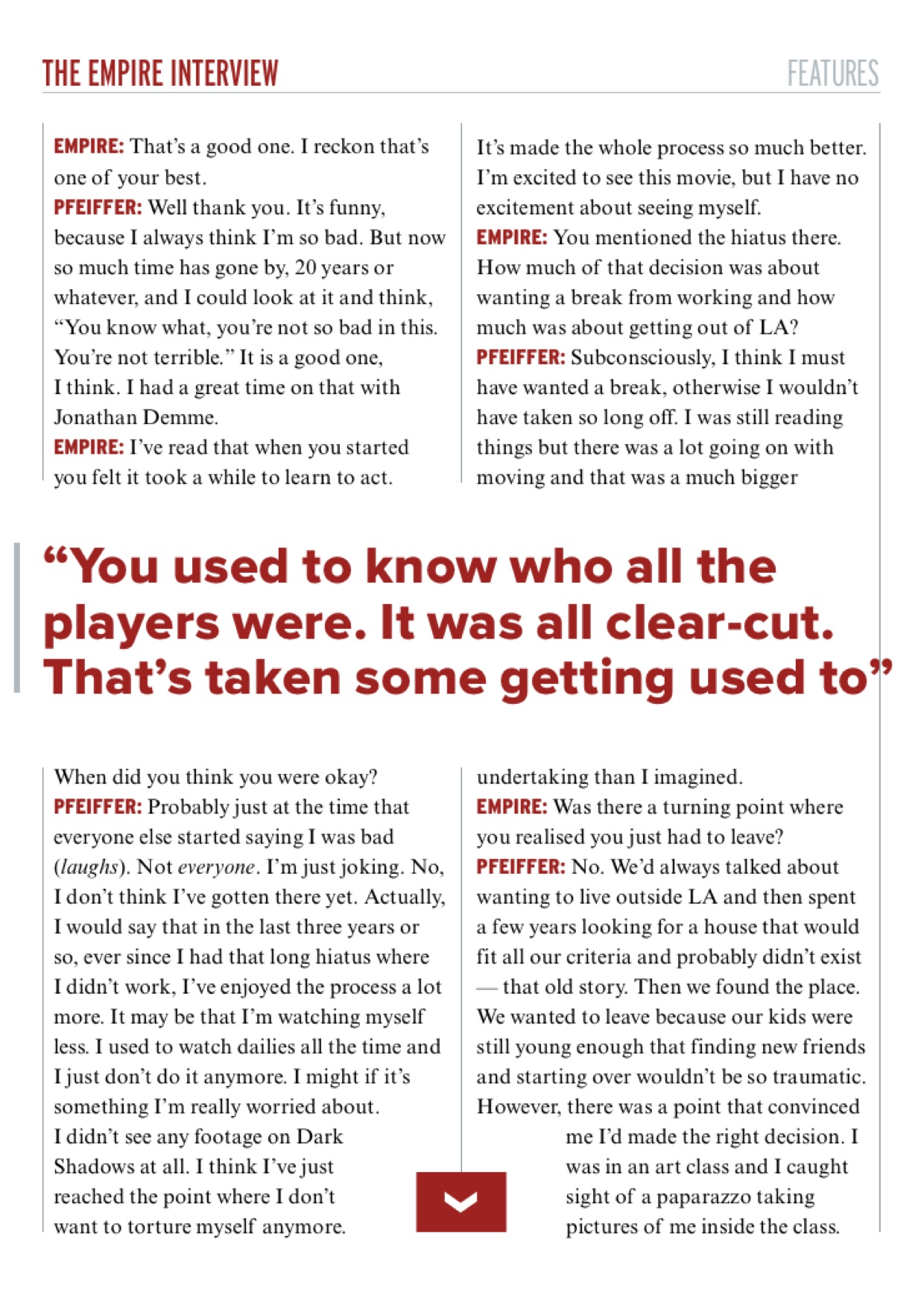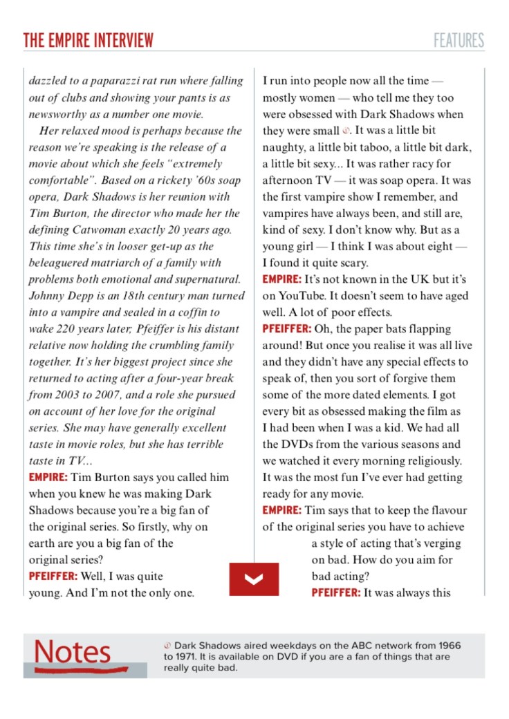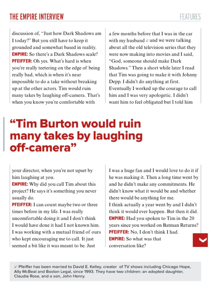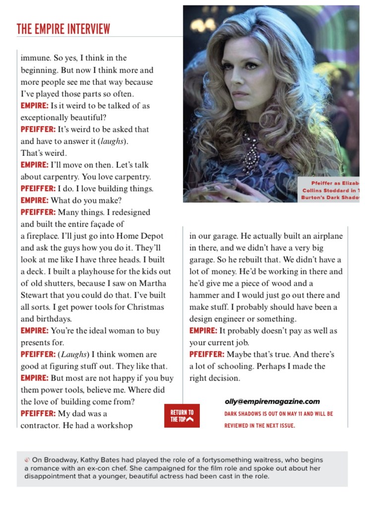 A rare career retrospective interview with Michelle Pfeiffer to coincide with the release of Tim Burton’s Dark Shadows.