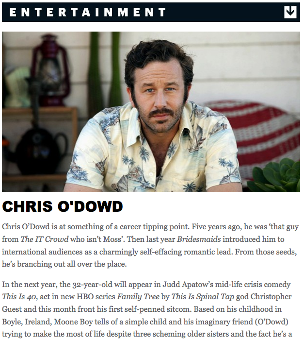 A Q&A interview with Chris O’Dowd to coincide with the release of Moone Boy, the Sky 1 sitcom which he co-wrote and appears in.