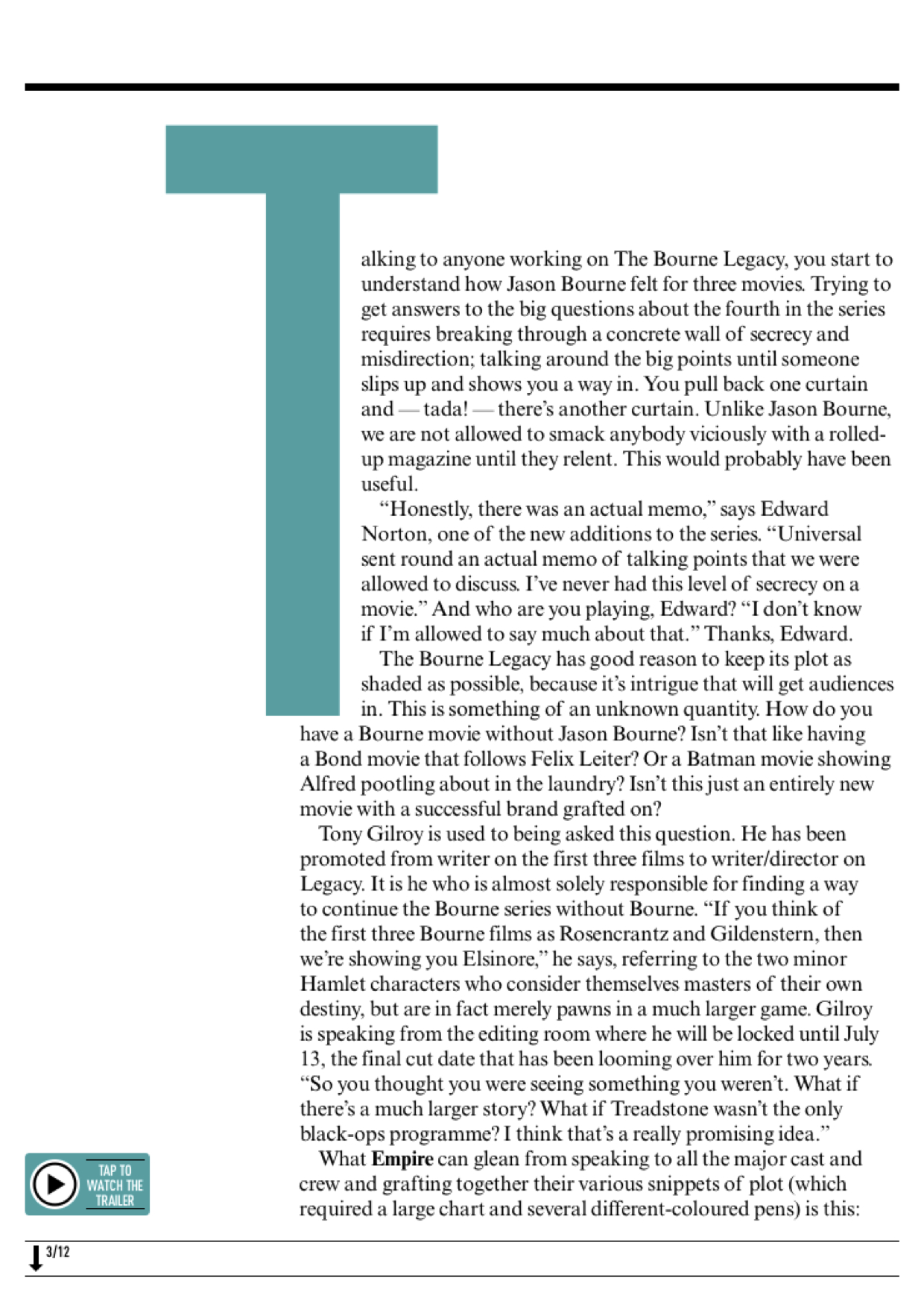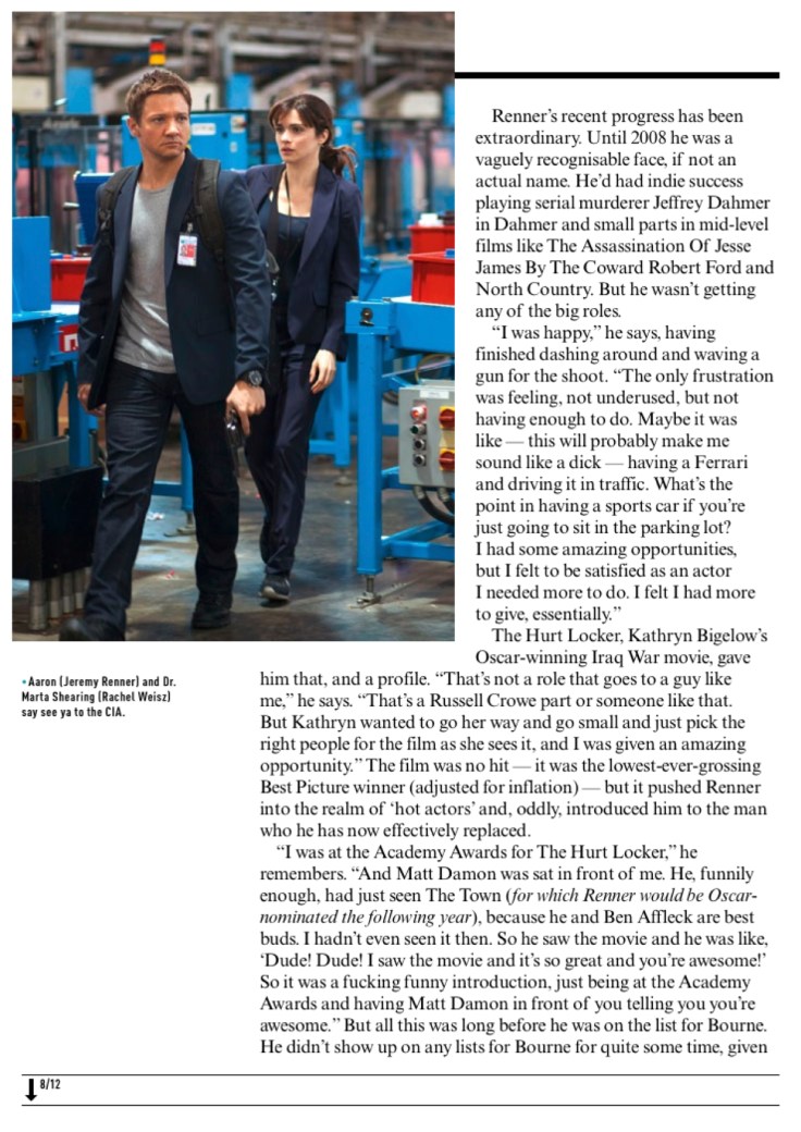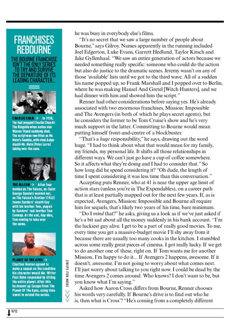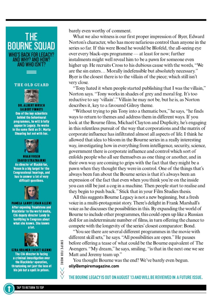 The Bourne Legacy, Empire Empire cover feature on The Bourne Legacy, the fourth film in the Bourne franchise. Includes interviews with Jeremy Renner, Edward Norton, Rachel Weisz and Tony Gilroy. Share this: Click to share on X (Opens in new window) X Click to share on Facebook (Opens in new window) Facebook Like Loading... Related Comments are closed.