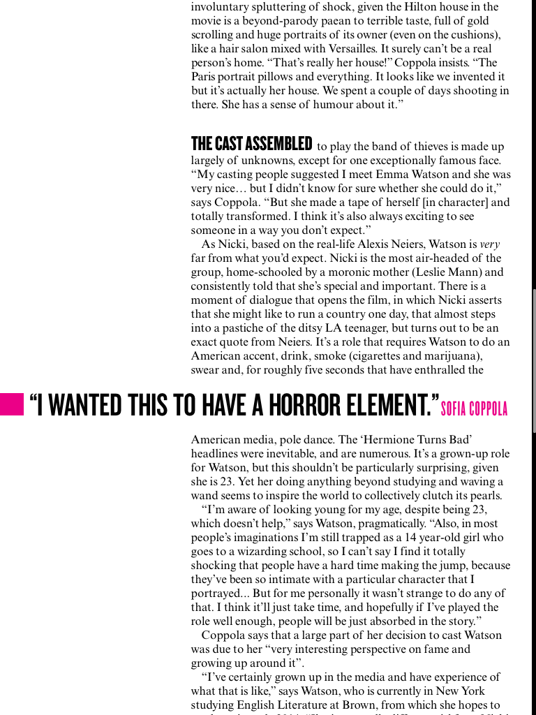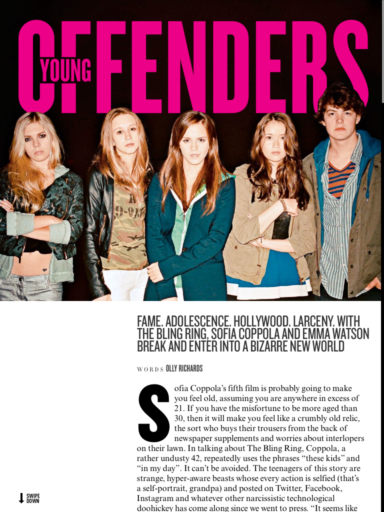 The Bling Ring, Empire A feature on Sofia Coppola’s latest movie, The Bling Ring, for Empire magazine, including interviews with Coppola and star Emma Watson. Share this: Click to share on X (Opens in new window) X Click to share on Facebook (Opens in new window) Facebook Like Loading... Related Comments are closed.