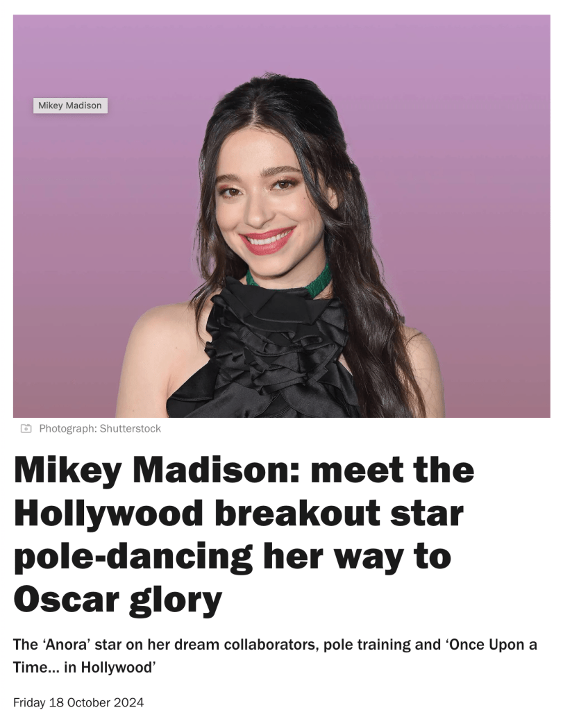 Mikey Madison – Time Out Mikey Madison of the Oscar-winning Anora, for Time Out. Find the full interview here. Share this: Click to share on X (Opens in new window) X Click to share on Facebook (Opens in new window) Facebook Like Loading... Related Comments are closed.